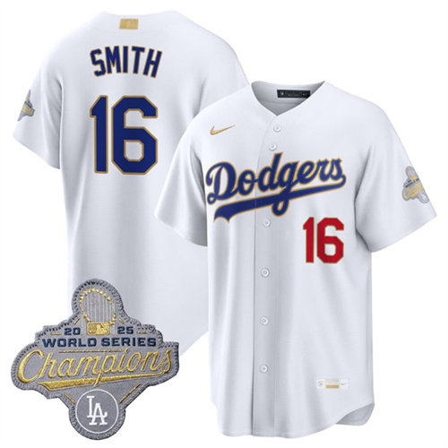 Men’s Los Angeles Dodgers #16 Will Smith White 2026 Gold Collection Stadium Stitched Baseball Jersey