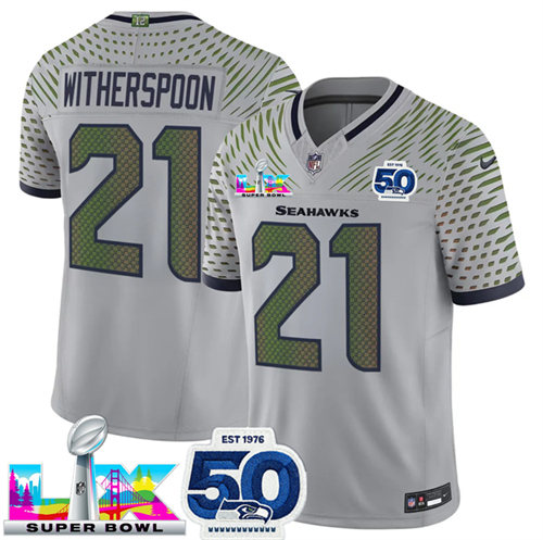 Men’s Seattle Seahawks #21 Devon Witherspoon Grey 2025 F.U.S.E. Super Bowl LX Patch And 50th Season Patch Rivalries Vapor Limited Stitched Football Jersey